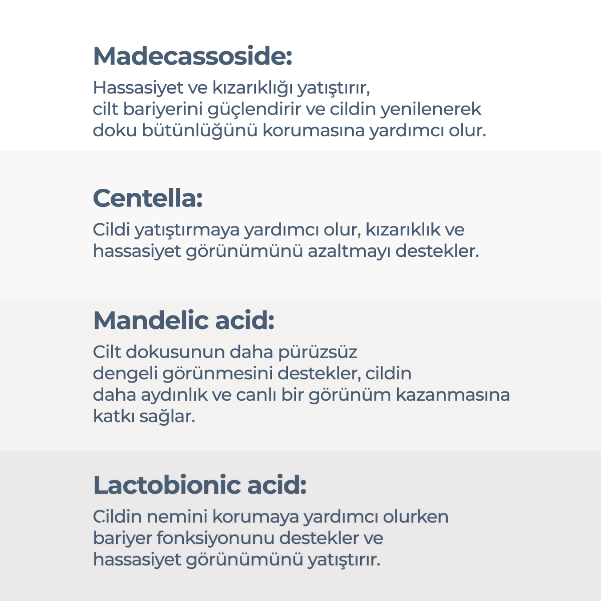 Madecassoside ve Centella Asiatica ile zenginleştirilen formül, cilt bariyerinin güçlenmesine yardımcı olurken hassasiyet ve kızarıklık görünümünü yatıştırmayı hedefler. Düzenli kullanımda cildin nem dengesini korur, ferah ve konforlu bir his bırakır.